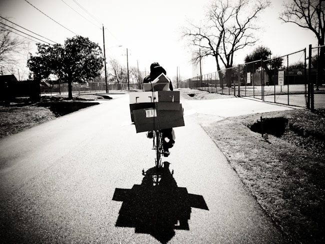 Back to the heart of my ever-exciting blog post. Conor and I love the convenience of ordering online and items showing up on our doorstop. In Houston we didn't order the recycling bins, nor have room to store them, so we chose to recycle cardboard only. Generally we would compile so much, we would put down the seat in the car and fill the entire space. This time, it was a nice, mild January day and we decided to ride our bikes to the recycling center a few miles away. I was doubtful it would all fit on Conor's bike--but look at his talent--and amazing use of bungee cords! We were laughing the entire way there--and got some of the strangest looks. We did impress the guy at the recycle center--he told us, "Now, that's what I call green recycling!" Maybe you won't be as impressed as he was, but perhaps it will give you a few good laughs. : )